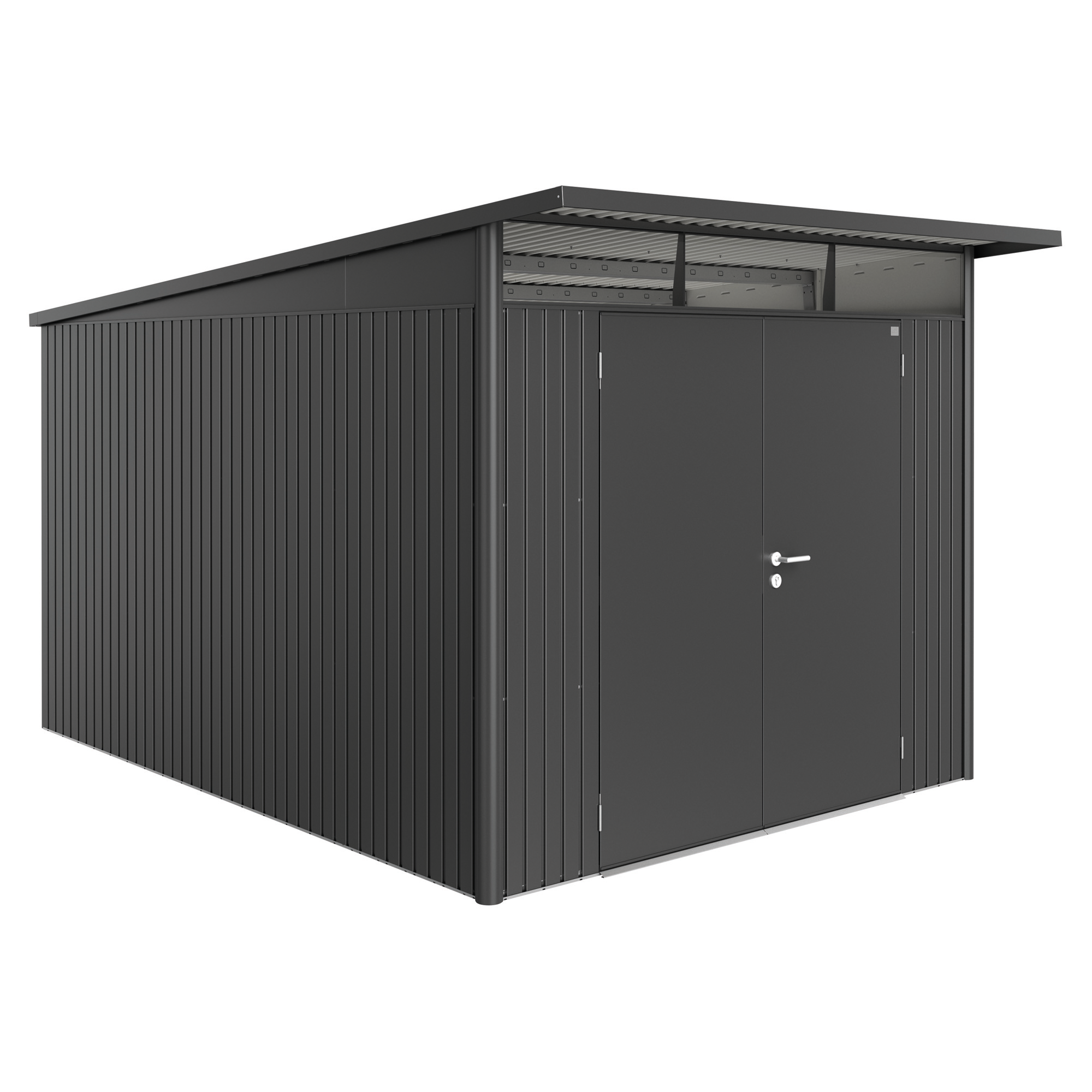 Das Biohort Gerätehaus „AvantGarde XXL“ in der Größe 260 x 380 cm bietet eine elegante und funktionale Lösung zur Aufbewahrung von Gartengeräten, Fahrrädern und anderen Utensilien. Die dunkelgraue Metallic-Oberfläche sorgt nicht nur für ein modernes Aussehen, sondern ist auch besonders wetterbeständig und langlebig.